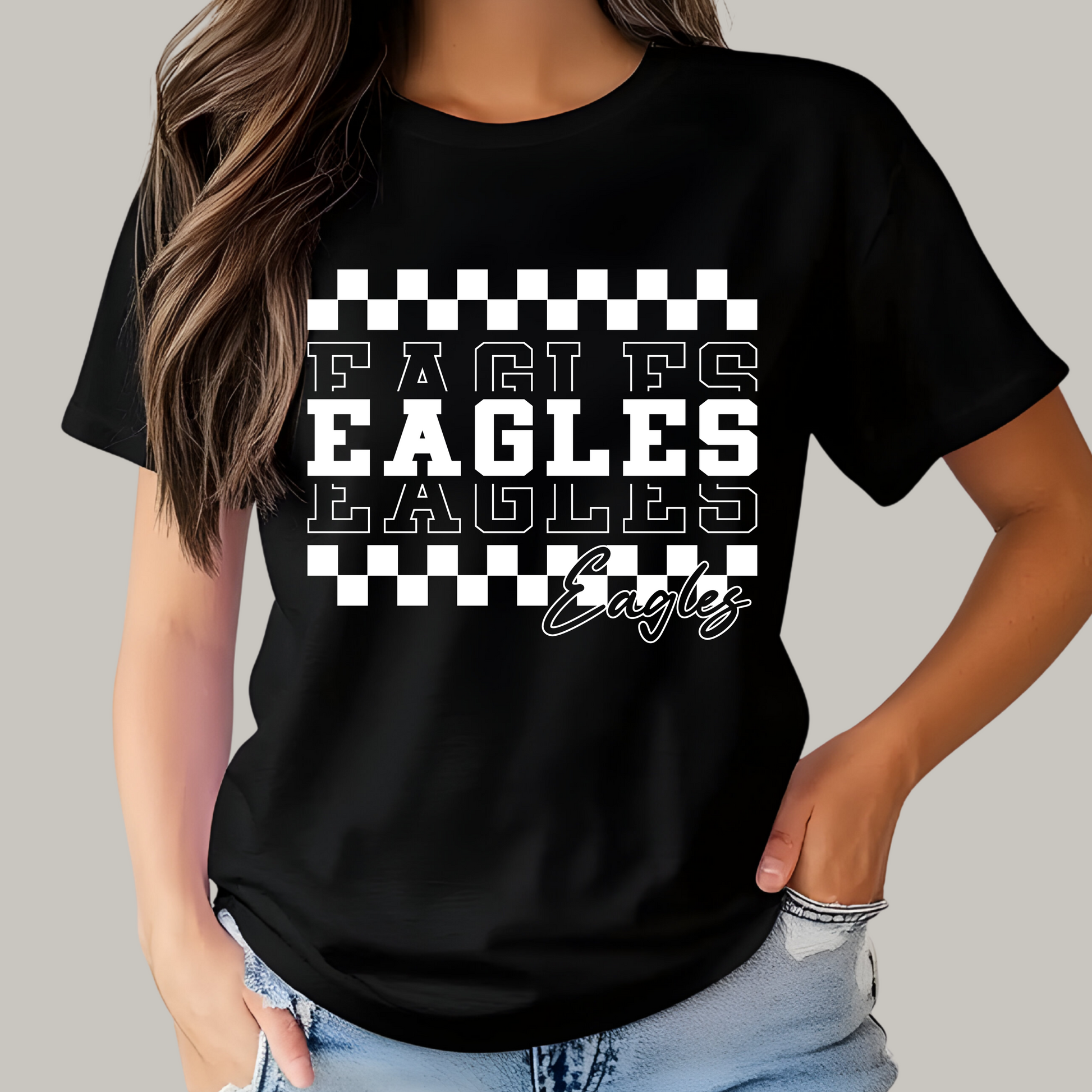 🖤 Make a bold statement with the Eagles Layered Game Day Mascot Tee, a must-have piece of Game Day School Spirit Wear that delivers effortless cool and serious school pride. Featuring a layered black-on-white design with “EAGLES” printed in a dynamic vertical stack—solid bold in the center, outlined above and below—this shirt roars confidence without saying a word.
